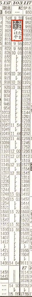 新宮9時35分発の準急はやたまは天王寺行きです。新宮と出ると、紀伊勝浦、湯川、古座、串本、紀伊椿、白浜口、紀伊田辺、南部、切目、御坊、紀伊湯浅、箕島と12駅に停車し、東和歌山には14時04分に到着します。ここから阪和線に入ります。阪和線内の停車駅は明らかではありませんが、終点の天王寺には15時06分に到着します。所要時間は5時間31分です。阪和線内の所要時間から考えると、阪和線内での停車駅は非常に少なかったと思われます。