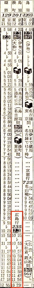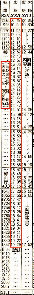 姫路に12時23分に到着します。ここで切り離しが行われ広島行きは9分停車し12時32分に出発します。岡山18分(津山線・宇野線の普通列車と連絡)、糸崎13分停車し、終点の広島には19時29分に到着します。所要時間は9時間04分です。