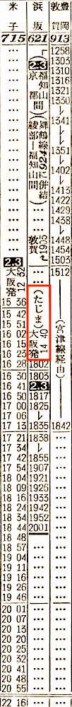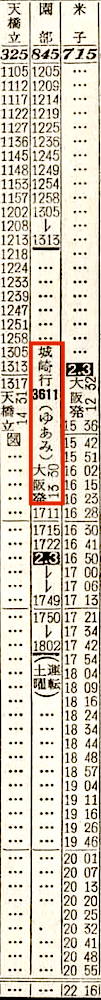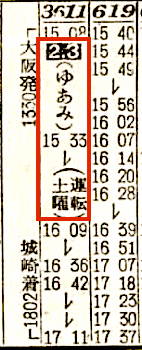 【臨時普通ゆあみ】3611:大阪1330-1503姫路☆1508-(播但線)-1711和田山1715-(山陰本線)-1802城崎【4時間32分】