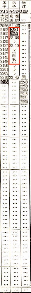 京都16時ちょうど発の準急白兎は米子行きです。山陰本線の京都〜福知山では唯一の優等列車です。京都を出ると、二条、亀岡、園部、綾部、福知山、和田山、八鹿、江原、豊岡、城崎、香住、浜坂、岩美、鳥取、浜村、松崎と16駅に停車し、上井には21時45分に到着します。