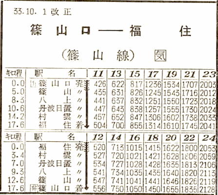 福知山線の篠山口から福住まで17.6kmの篠山線です。山陰本線の園部まで建設予定でしたが中止されてしまいました。1972年(昭和47年)3月1日に廃止となりました。