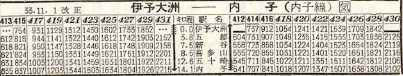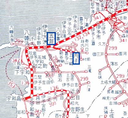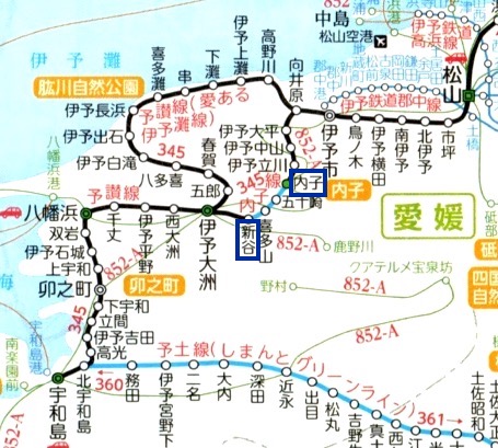 1986年(昭和61年))3月3日に予讃本線の短絡ルート(向井原−内子−伊予大洲)が完成しましたが、この短絡ルートの内、新谷(正確には伊予若宮信号場)から内子は予讃本線とはならず内子線のまま残りました。