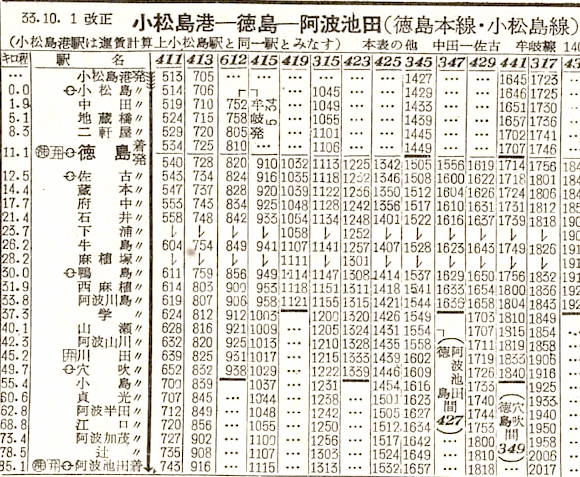 次は徳島本線・高徳本線の徳島〜小松島港の小松島線です。こちらも盲腸線です。この時代には徳島〜中田もまだ小松島線でした。1961年(昭和36年)4月になり徳島〜中田が牟岐線に編入されました。8往復ほどの列車が設定されています。1985年(昭和60年)3月14日に全線が廃止となりました。