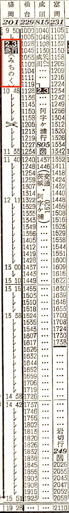 上野9時50分発の急行みちのくは常磐線経由の盛岡行きです。上野を出ると、土浦、水戸、日立、湯本、平、末続、原ノ町に停車し、仙台には15時51分に到着します。ここで東北本線経由の急行青葉を連結します。
