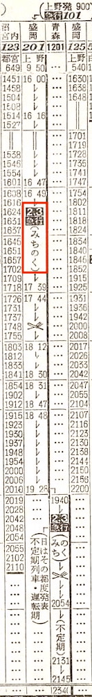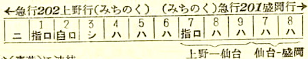 【急行みちのく】201:上野0950-(常磐線)-1551仙台★1600-(東北本線)-1928盛岡【9時間38分】