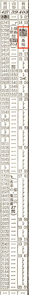 福島から秋田行きは急行鳥海となり、奥羽本線に入ります。福島で16分停車後に出発し、米沢、赤湯、上ノ山、山形、天童、楯岡、新庄、湯沢、十文字、横手、大曲に停車し、終点の秋田には20時35分に到着します。所要時間は、11時間35分です。