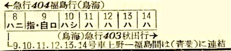 【急行鳥海】403:上野0900-(急行青葉:101)(東北本線)-1403福島☆1419-(奥羽本線)-2035秋田【11時間35分】