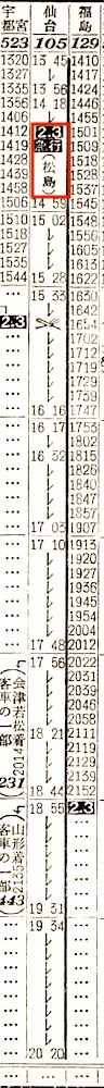 上野13時45分発の急行松島は仙台行きです。上野を出ると、赤羽、大宮、小山、宇都宮、西那須野、黒磯、白河、郡山、二本松、福島、白石に停車し、終点の仙台には20時20分に到着します。所要時間は6時間35分です。なお、郡山で客車の1両は切り離され磐越西線で会津若松(20時14分着)へ、福島で客車の1両は切り離され奥羽本線で山形(21時35分着)へ向かいます。