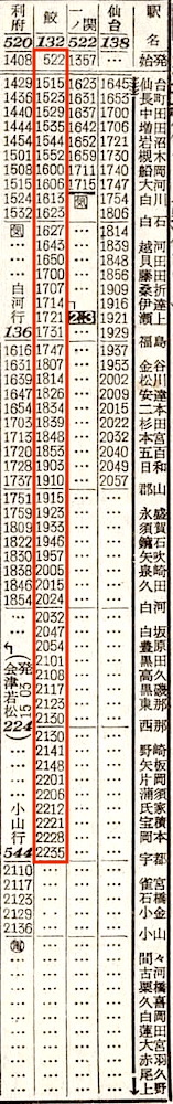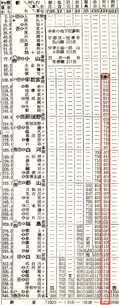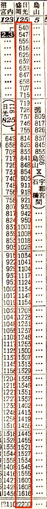 上野5時40分発の普通列車は盛岡・日光行きです。2等席の設備があります。宇都宮に7時55分に到着し、日光行きを切り離します。盛岡行きは、宇都宮に19分停車後、白河6分、郡山14分、福島9分、白石9分停車し、仙台には16時16分に到着します。
