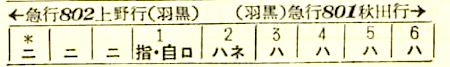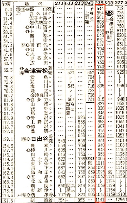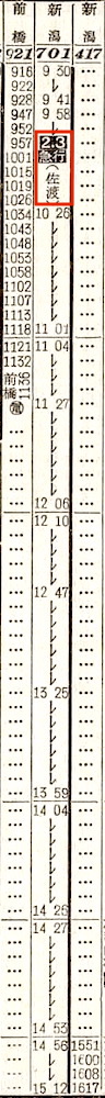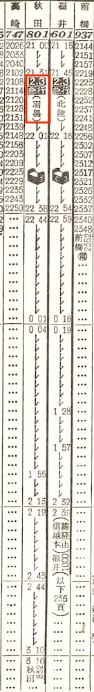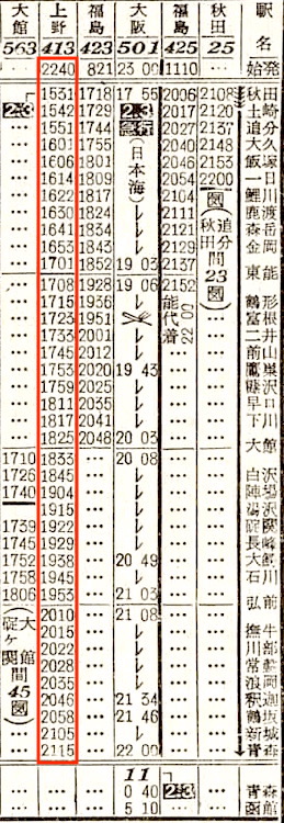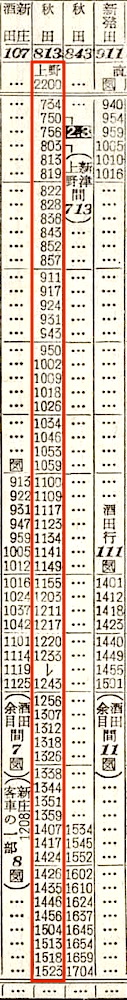 【寝台急行羽黒】801:上野2100-(高崎線)-2238高崎2244-(上越線)-0213長岡0219-(信越本線)-0310新津0316-(羽越本線)-0832秋田【11時間32分】