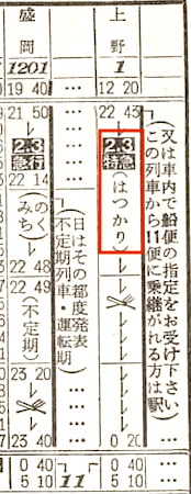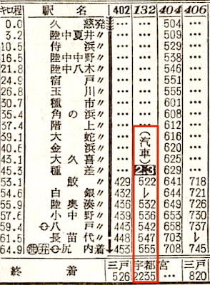 八戸線の鮫(さめ)5時22分発の普通列車は宇都宮行きです。2等席の設備もあり、(汽車)と記載してあります。(汽車)とは蒸気機関車のことでしょうか? 東北本線の尻内には5時55分に到着します。