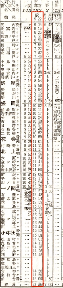 上野19時15分発の寝台急行十和田は青森行きです。上野を出ると、土浦、水戸、日立、湯本、平、原ノ町、中村に停車し、仙台には1時23分に到着します。上野20時05分発の寝台急行北斗も青森行きです。上野を出ると、土浦、水戸、日立、平、原ノ町に停車し、仙台には2時03分に到着します。