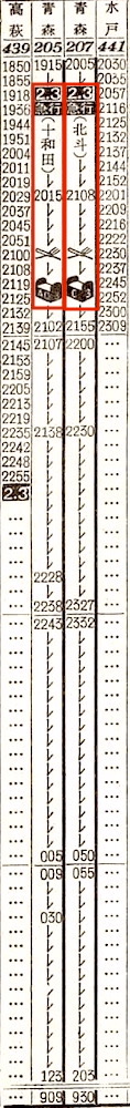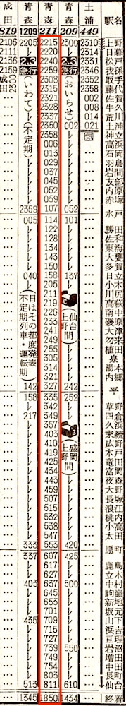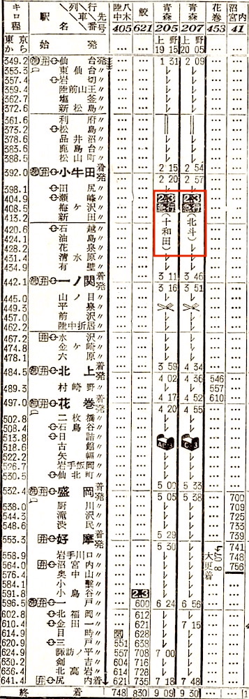 仙台に10分停車後、松山町で日付が変わります。小牛田8分、一ノ関21分、北上11分停車し、盛岡には4時45分に到着します。ここで大館行きを切り離します。青森行きは、盛岡に30分停車し、尻内には9時09分に到着します。