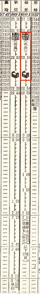 上野21時15分発の寝台急行北陸は福井行きです。上野を出ると、大宮、熊谷、高崎と停車し、高崎からは上越線に入ります。水上で日付が変わり、六日町、越後堀之内(小出の誤植か?)に停車し、長岡には2時32分に到着します。