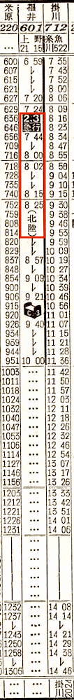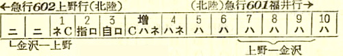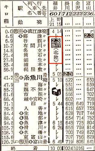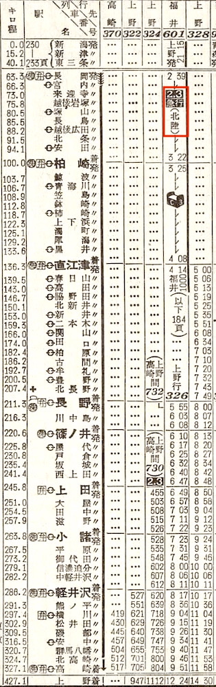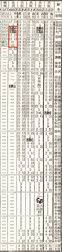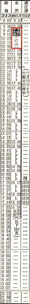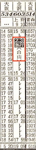 【急行白山】603:上野0910-(高崎線)-1045高崎1050-(信越本線)-1532直江津1538-(北陸本線)-1909金沢【9時間59分】