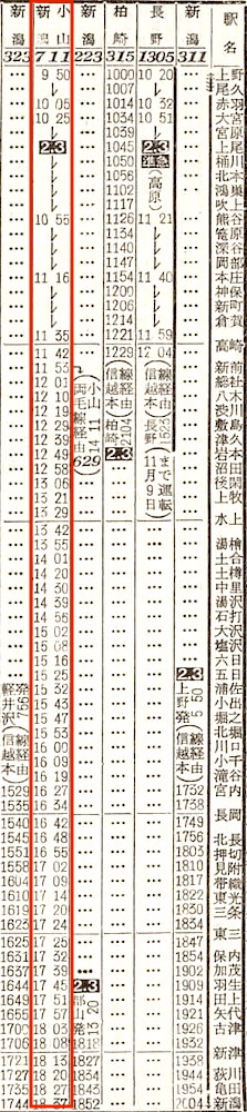 新潟行きは高崎から信越本線に入ります。軽井沢7分、小諸7分、長野6分、直江津8分、柏崎13分停車し、長岡には17時38分に到着します。上記の上越線経由では長岡には12時56分に到着しますので、乗り間違えると4時間42分遅れて到着することになってしまいますので、注意が必要です。
