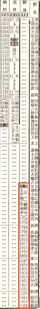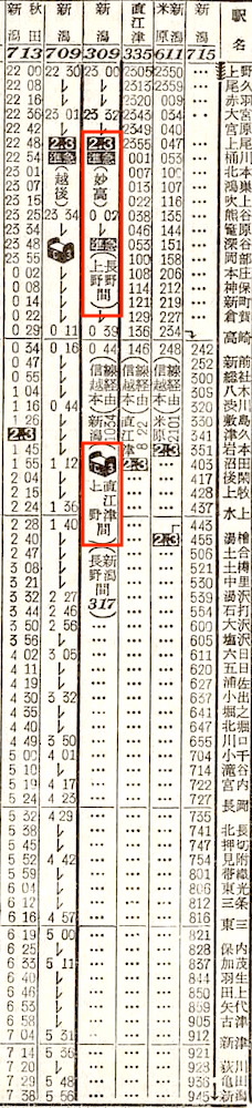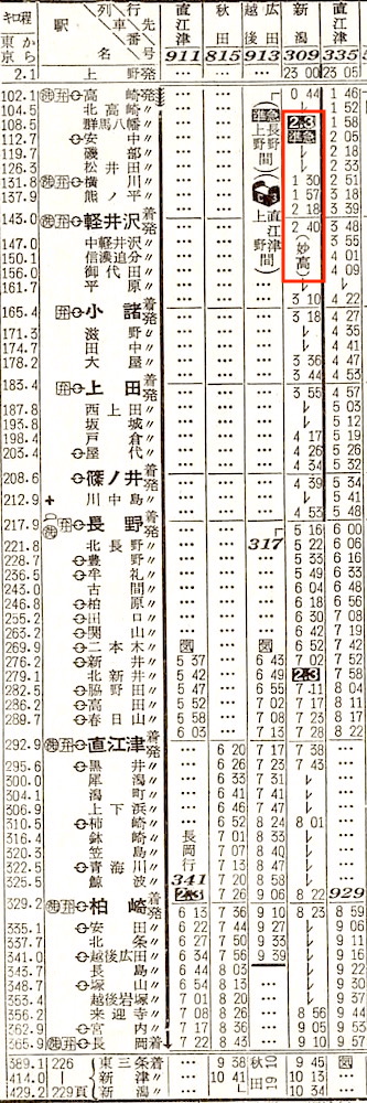 【寝台準急妙高】309:上野2300-(高崎線)-0039高崎0044-(信越本線)-0453長野【5時間53分】