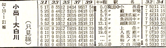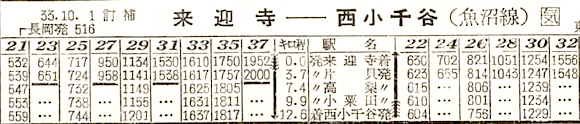 信越本線の来迎寺〜西小千谷の魚沼線です。来迎寺〜片貝4往復、来迎寺〜西小千谷5往復の列車が設定されています。1984年(昭和59年)4月1日に廃止となりました。