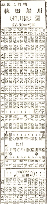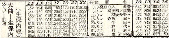 奥羽本線の追分〜船川の船川線です。12往復と区間列車が設定されています。1968年(昭和43年)4月1日に、船川を男鹿に駅名改称とともに、線名も男鹿線となりました。時刻表のスペースを活かすために時刻部分は横向きになっています。