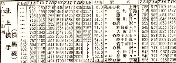 東北本線の黒沢尻〜奥羽本線の横手の横黒線です。7往復の列車が設定されています。1954年(昭和29年)11月10日に黒沢尻駅が北上駅に改称され、1966年(昭和41年)10月20日に路線名が北上線に改称されました。