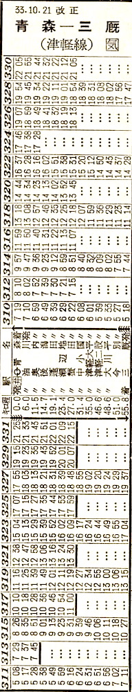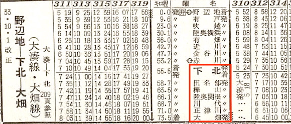 大湊線の下北〜大畑の大畑線です。5往復の列車が設定されています。1985年(昭和60年)7月1日に下北交通に転換されましたが、2001年(平成13年)4月1日に廃止されました。