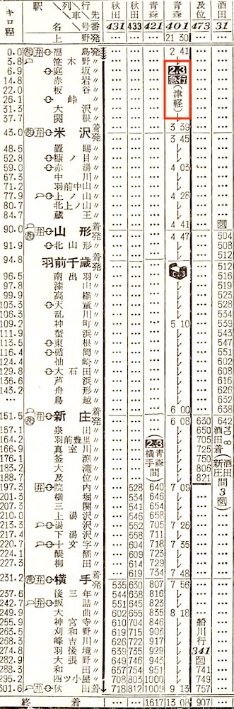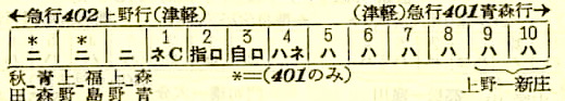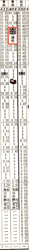 【寝台急行津軽】401:上野2130-(東北本線)-0233福島0241-(奥羽本線)-1308青森【15時間38分】