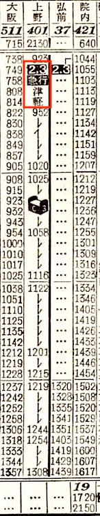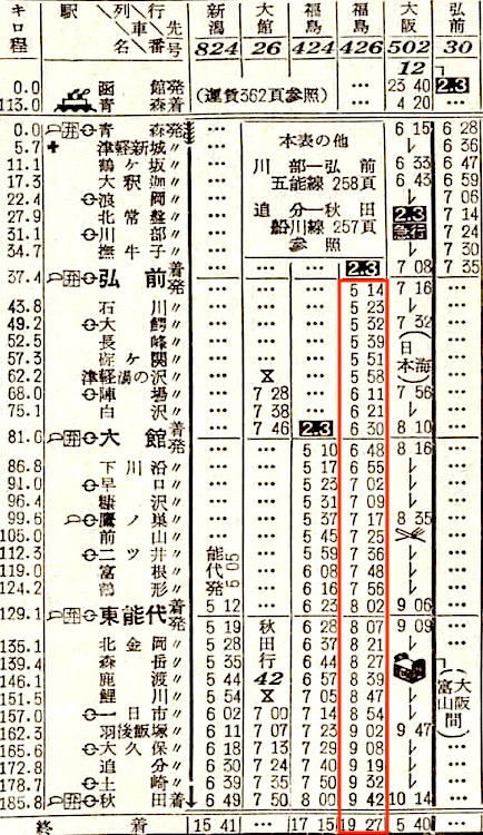 【寝台急行日本海】502:青森0615-(奥羽本線)-1014秋田1025-(羽越本線)-1541新津1547-(信越本線)-1816直江津1823-(北陸本線)-0306米原0330-(東海道本線)-0540大阪【23時間25分】