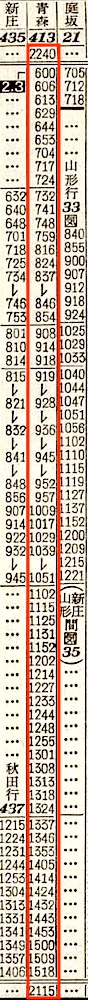 【夜行普通】413:上野2240-(東北本線)-0551福島0600-(奥羽本線)-2115青森【22時間35分】