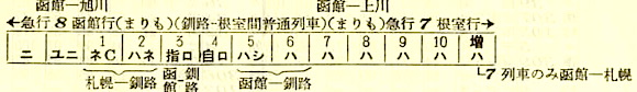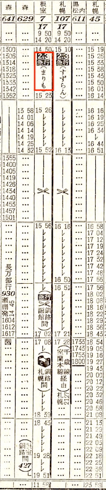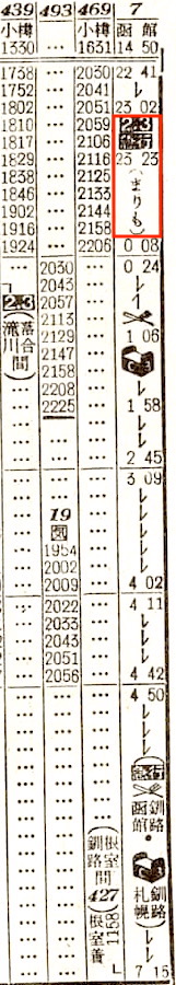 【寝台急行まりも】8:根室1625-(428)(普通)-1956釧路2030-(根室本線)-0540滝川0548-(函館本線)-1351函館【釧路〜函館:17時間21分、根室〜函館:21時間26分】