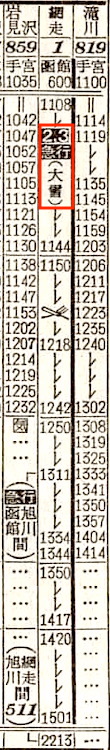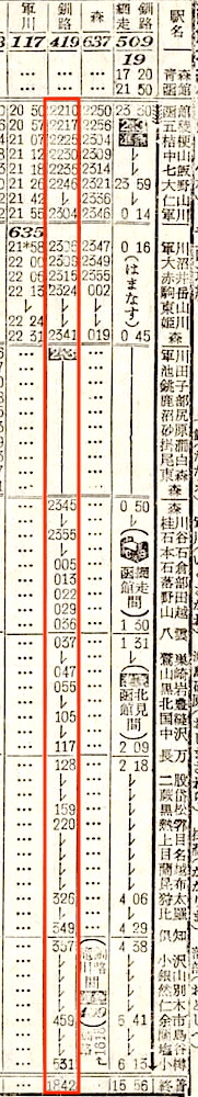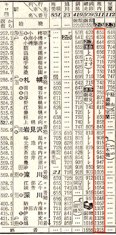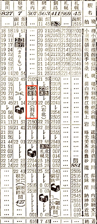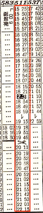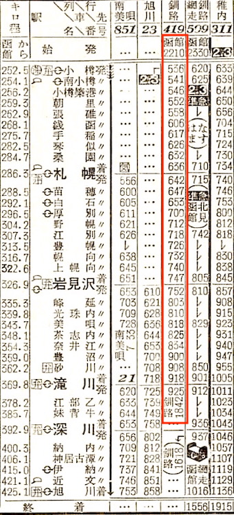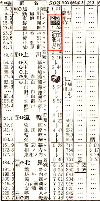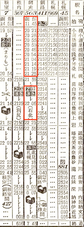 【寝台準急石北】503:函館1145-(普通)(函館本線)-2123札幌2139-(準急石北)-0048旭川0101-(石北線)-0546北見0615-(普通)(網走本線)-0743網走【札幌〜北見:8時間07分、函館〜網走:19時間58分】