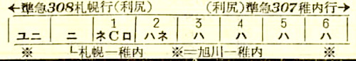 【寝台準急利尻】308:稚内2100-(宗谷本線)-0247旭川0255-(函館本線)-0600札幌【9時間00分】