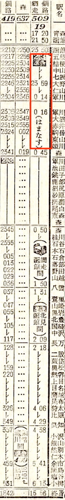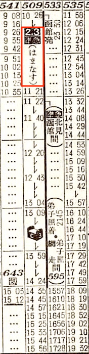 【寝台準急はまなす】509:函館2330-(函館本線)-0901滝川☆0912-1016旭川1026-(石北線)-1424北見1435-(普通)(網走本線)-1556網走【函館〜北見:14時間54分、函館〜網走:16時間26分】