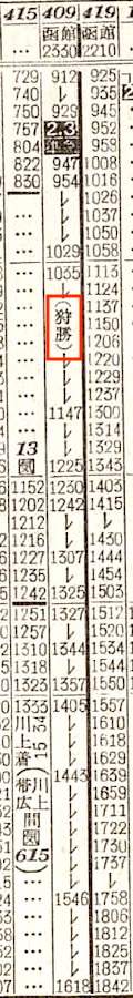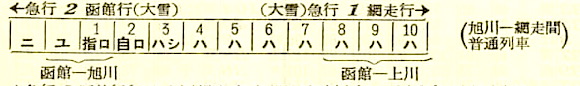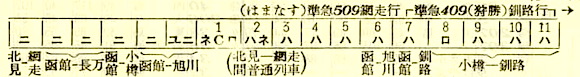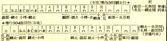 【寝台準急石北】504:網走2044-(普通)(網走本線)-2210北見2215-(準急石北)(石北線)-0328旭川0343-(函館本線)-0655札幌0704-(普通)-1642函館【北見〜札幌:8時間40分、網走〜函館:19時間58分】