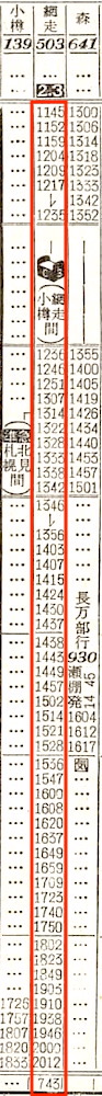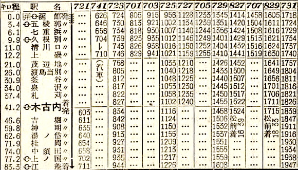 函館6時ちょうど発の急行大雪は旭川・網走行きです。函館を出ると、軍川、森、八雲、長万部、倶知安、小沢に停車し、小樽には11時03分に到着します。