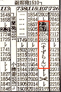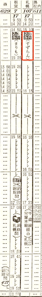 【急行すずらん】107:函館1510-(函館本線)-1721長万部1728-(室蘭本線)-1957苫小牧2002-(千歳線)-2127札幌【6時間17分】