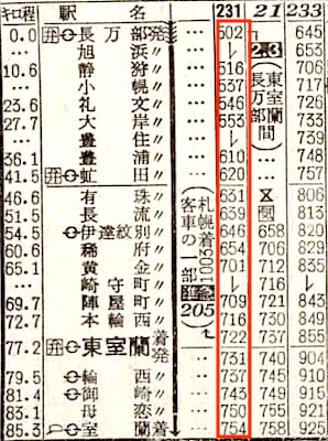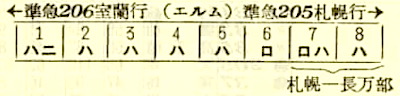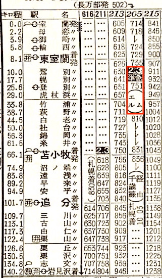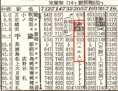 【準急エルム】205:長万部0502-(231)(室蘭本線)-0722東室蘭★0735-0831苫小牧0836-(千歳線)-1003札幌【5時間01分】