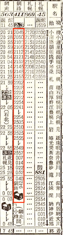 【寝台普通】411:小樽2045-(函館本線)-0032滝川0040-(根室本線)-0942釧路【12時間57分】