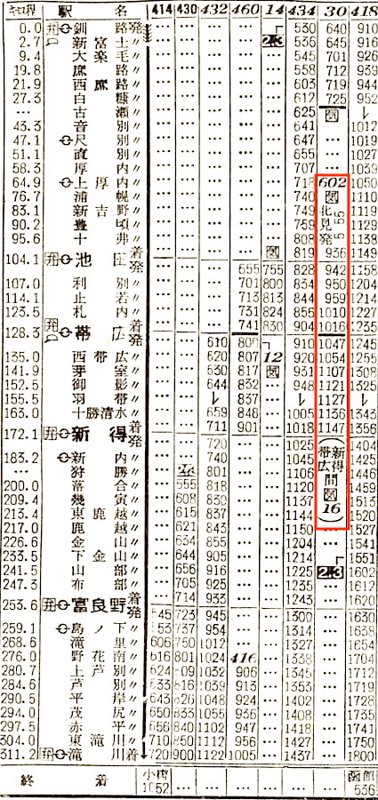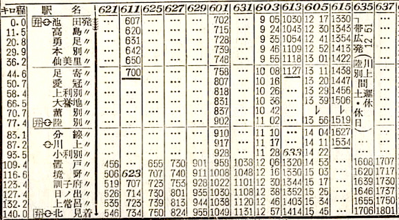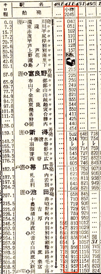 釧路行きは滝川から根室本線に入り、準急狩勝となります。赤平、芦別、上芦別、富良野、落合、新得、十勝清水、芽室、帯広、止若、池田、浦幌、白糠に停車し、終点の釧路には16時18分に到着します。所要時間は16時間48分です。