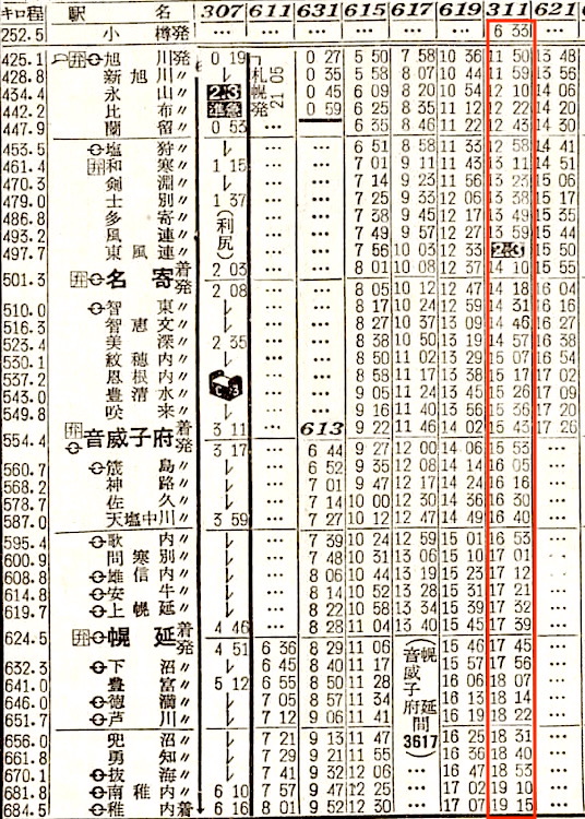 【普通】316:音威子府0612-(宗谷本線)-1019旭川1035-(函館本線)-1540小樽【9時間28分】