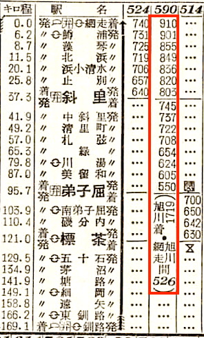 【普通】590:弟子屈0550-(釧網本線)-0910網走0928-(526)(網走本線)-1051北見1102-(石北線)-1719旭川【11時間29分】