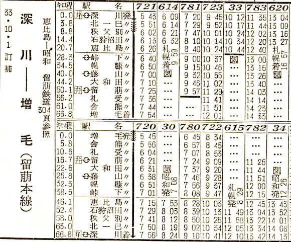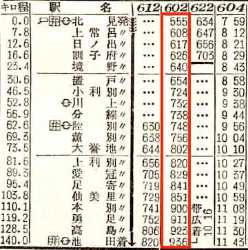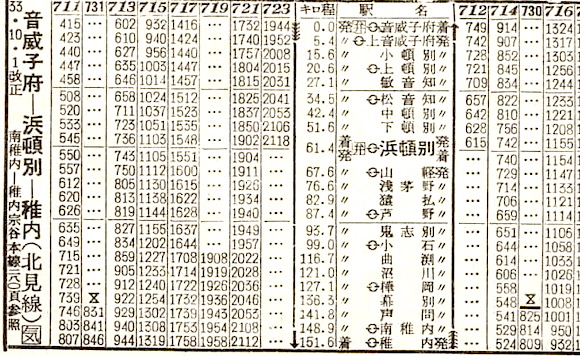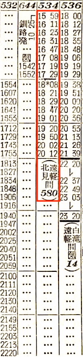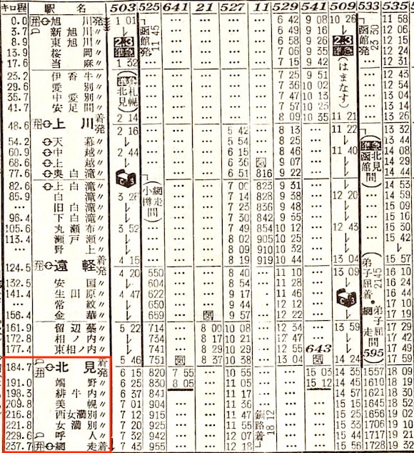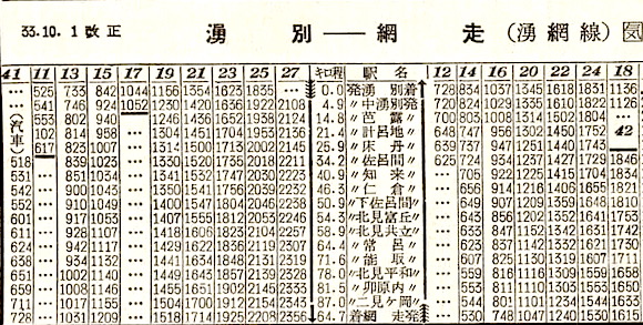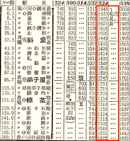 網走から網走本線に入ります。網走には18分停車し、北見11分(北見から石北線)、遠軽16分停車し、終点の旭川には17時19分に到着します。所要時間は11時間29分です。1958年では、池田〜陸別〜北見〜網走が網走本線でした。