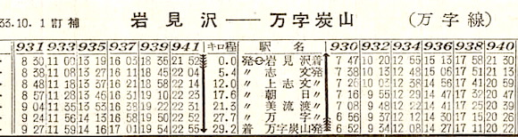 室蘭本線・志文〜万字炭山の万字線です。6往復の列車が設定されています。しかし1985年(昭和60年)4月1日に全線廃止となりました。