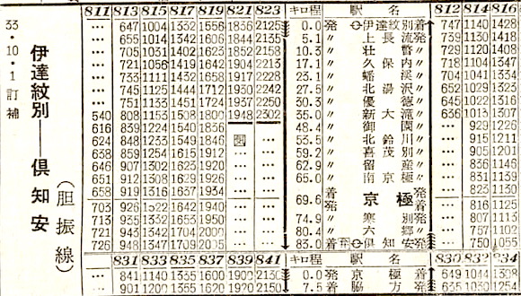函館本線・倶知安〜京極〜室蘭本線・伊達紋別、京極〜脇方の胆振線です。倶知安〜京極〜伊達紋別に4往復と区間列車が、京極〜脇方に6往復の列車が設定されています。しかし1970年(昭和45年)11月1日に京極〜脇方が廃止となり、1986年(昭和61年)11月1日に全線廃止となりました。