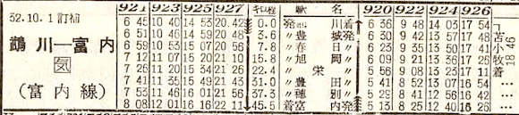 函館本線・深川〜宗谷本線・名寄の深名線です。深川〜朱鞠内6往復、朱鞠内〜名寄4往復、と区間列車が設定されています。しかし1995年(平成7年)9月4日に廃止となりました。