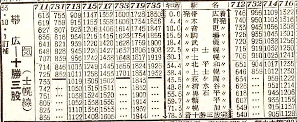 根室本線・帯広〜十勝三股の士幌線です。帯広〜十勝三股3往復、帯広〜上士幌3往復の列車が設定されています。しかし1987年(昭和62年)3月23日に廃止となりました。