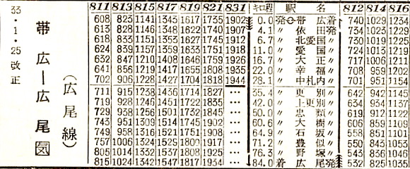 根室本線・帯広〜広尾の広尾線です。6往復と区間列車が設定されています。しかし1987年(昭和62年)2月2日に廃止となりました。