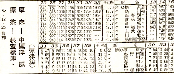 釧網本線・標茶〜中標津〜根室標津、中標津〜根室本線・厚床の標津線です。標津〜根室標津5.5往復、標津〜中標津1往復、中標津〜厚床5往復の列車が設定されています。しかし1989年(平成元年)4月30日に廃止となりました。