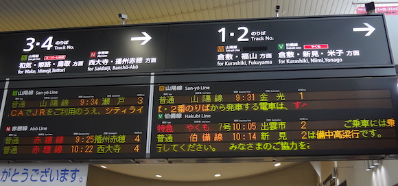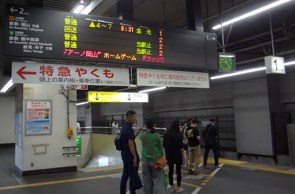 当初は倉敷1155-1212岡山の列車に乗る予定だったが、ネットで遅延情報があったため、1本早めの列車に飛び乗ったわけだ。