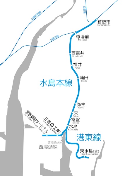 水島臨海鉄道路線図(三菱自工前〜倉敷貨物ターミナルと、水島〜東水島の港東線は貨物のみの取り扱い)