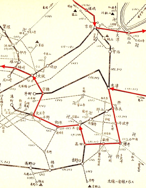 天王寺13時20分発の城東線(現大阪環状線)で大阪へは13時43分に到着します。